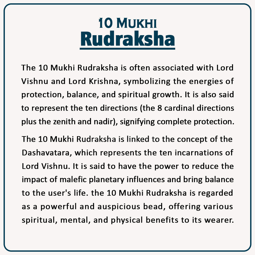 The 10 Mukhi Rudraksha is a powerful bead that represents Lord Vishnu. It protects the wearer from negative energies, black magic, evil spirits, and the fear of loneliness. This sacred bead is believed to provide mental peace, physical health, confidence, financial prosperity, and spiritual growth. Wearing it brings fame, respect, and relief from obstacles in life.