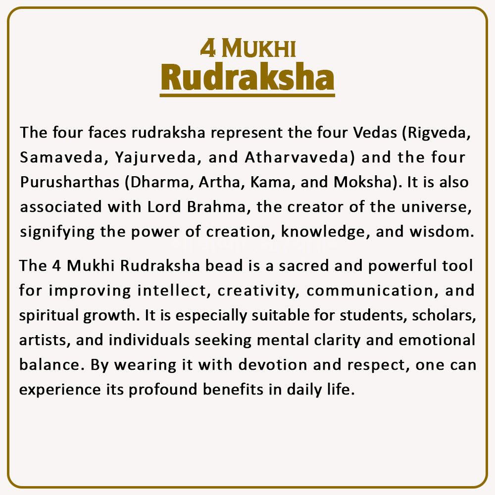 Blessed by Lord Brahma, the divine creator of the cosmos, the 4 Mukhi Rudraksha is a powerful bead that channels supreme creative energy. Known as Prajapati and the father of the Vedas, Lord Brahma inspires intellect, innovation, and spiritual wisdom. Wearing this sacred bead helps you embrace knowledge, creativity, and personal transformation with confidence and clarity.