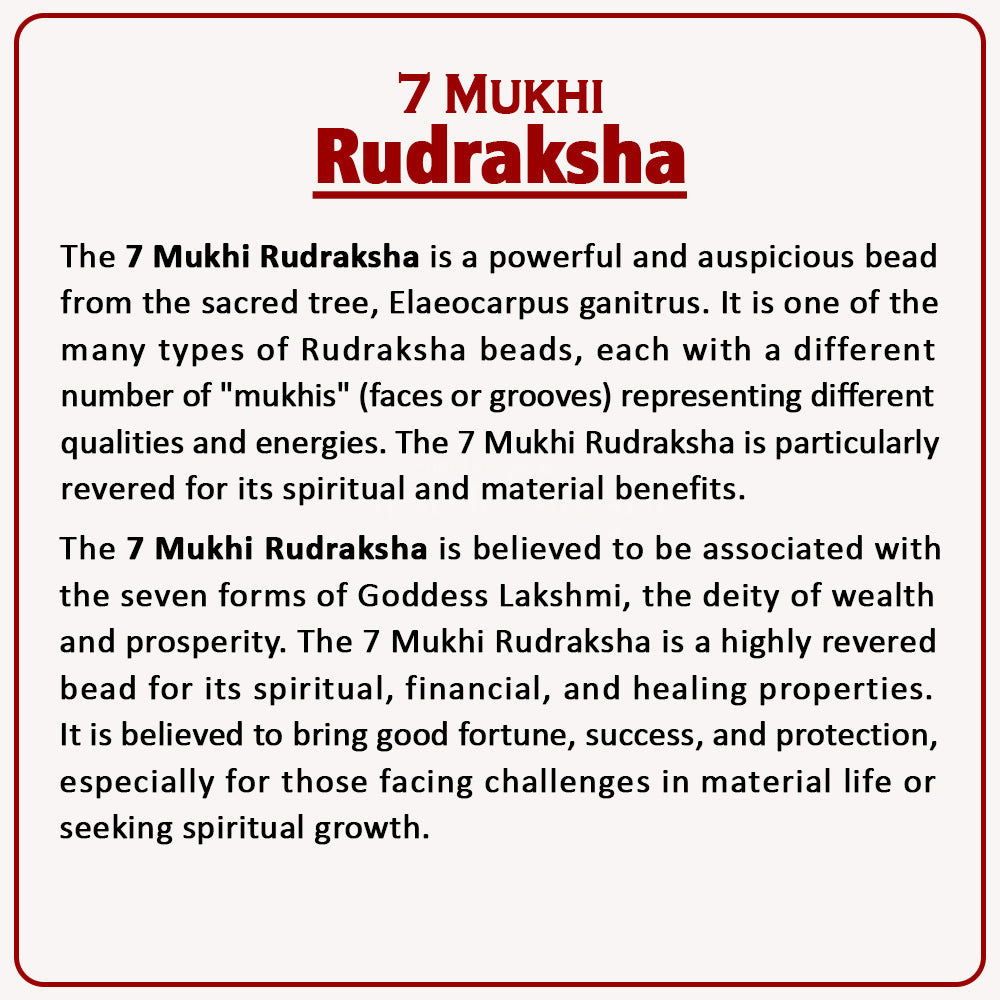 The 7 Mukhi Rudraksha is a sacred bead blessed by Goddess Mahalakshmi, the divine embodiment of wealth, abundance, and fortune. Revered as a symbol of prosperity and positivity, this Rudraksha is believed to attract success, remove obstacles, and bring good luck to the wearer.