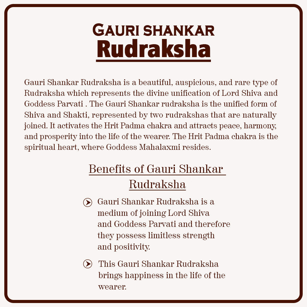 The Gauri Shankar Rudraksha is a natural light brown Rudraksha from Nepal, formed by the combination of two Rudrakshas joined together. It symbolizes the union of mind and soul, representing the eternal bond between Lord Shiva and Goddess Parvati.