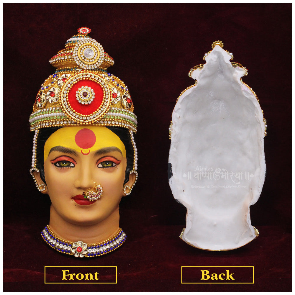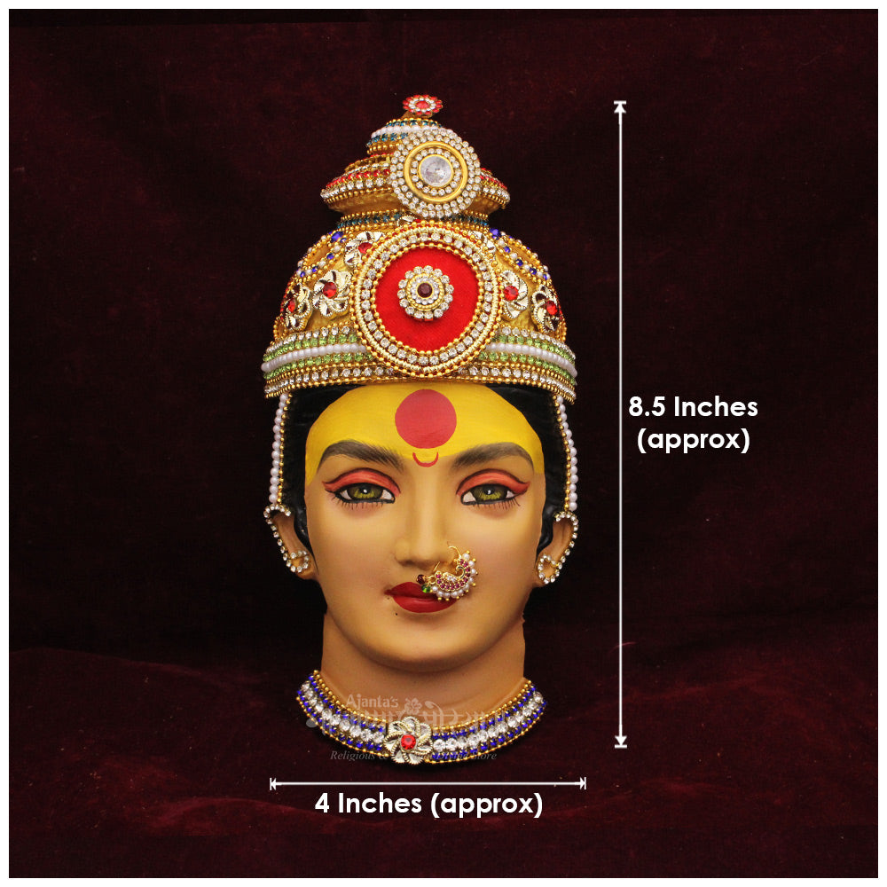 Measuring approximately 8.5 inches in height and 4 inches in width, it is the perfect size for home temples, Navratri setups, or festive worship décor. Each detail — from the expressive eyes and golden tilak to the ornate bejeweled crown — is meticulously handcrafted to enhance your pooja ambience.