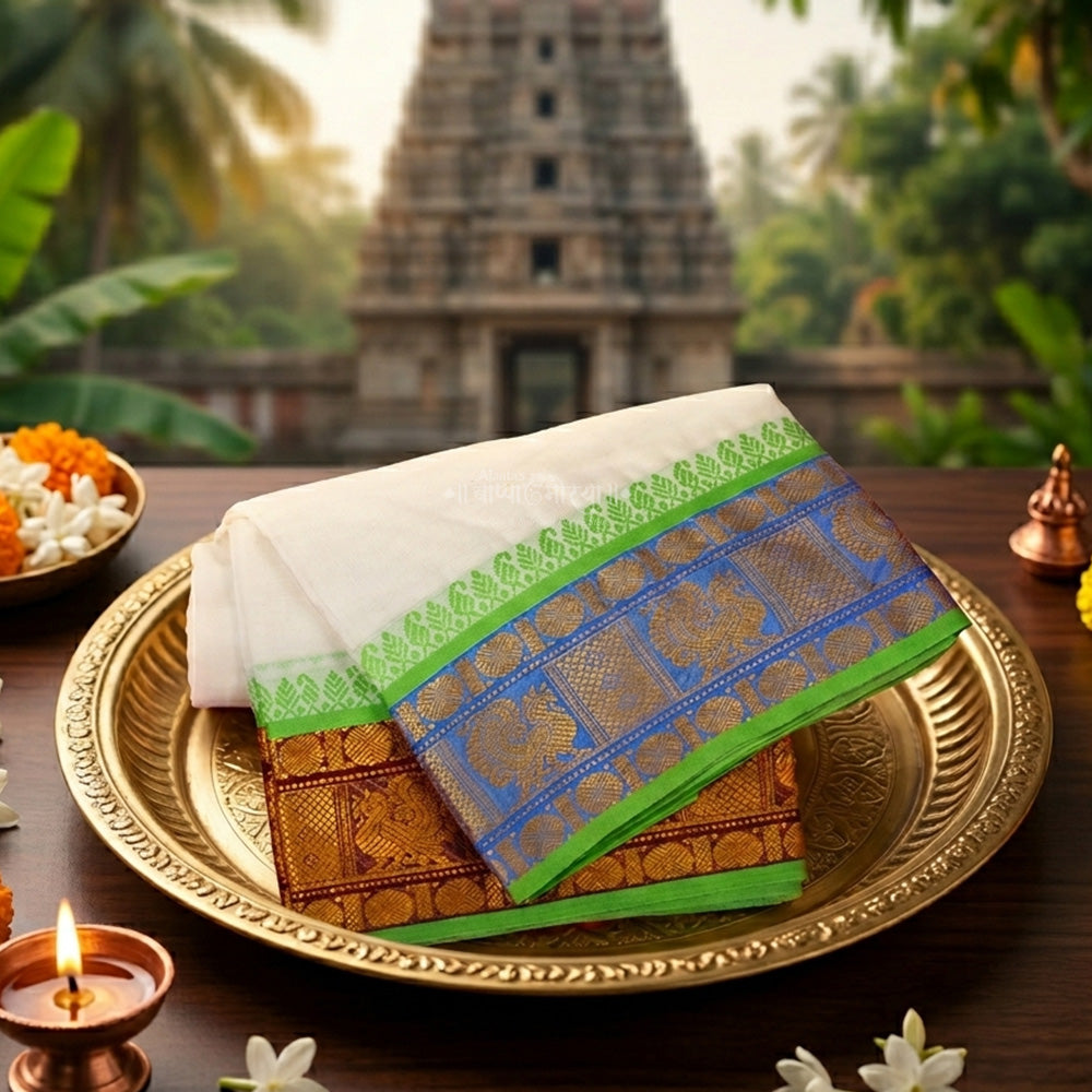 The dhoti is made from soft and breathable cotton fabric, ensuring comfort even during long hours of wear. Its beautiful green temple border combined with intricate golden zari weaving adds a rich and divine appearance, making it ideal for puja, weddings, cultural functions, and spiritual events.