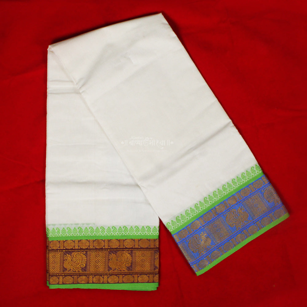 This Traditional White Cotton Dhoti with Green & Golden Zari Border represents the elegance of Indian culture and heritage. Designed for religious rituals, temple visits, festivals, and traditional ceremonies, this dhoti offers a classic and graceful look.