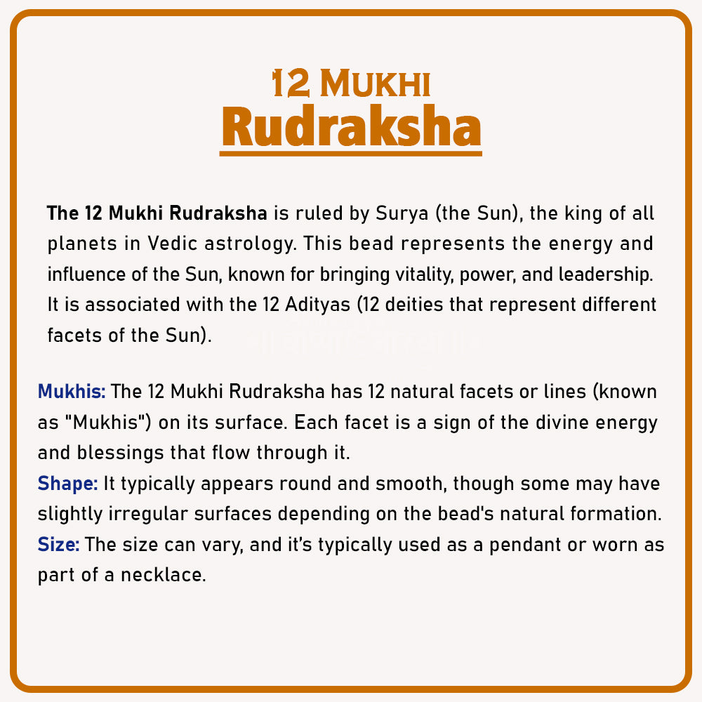 The 12 Mukhi Rudraksha is a sacred bead that represents the powerful energy of the Sun God (Surya Dev). Known as the “Dwadash Aditya Rudraksha,” it radiates vitality, brilliance, and authority. Wearing this Rudraksha is believed to bless the devotee with confidence, leadership qualities, courage, and inner strength, while removing fear, doubt, and negativity.
