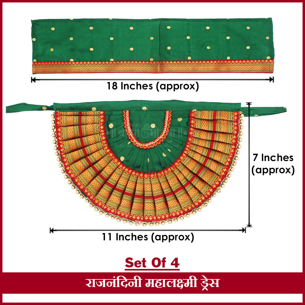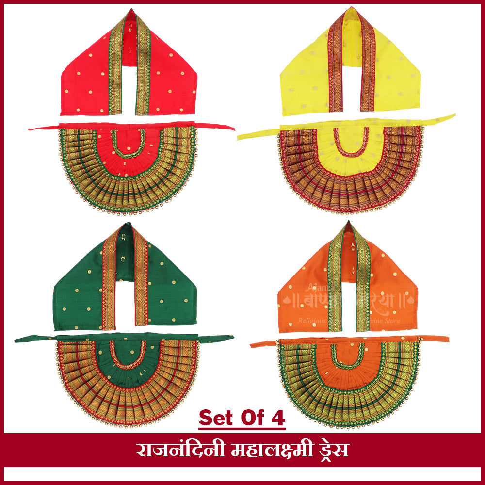Enhance the divine beauty of your Goddess idol with this stunning Rajnandani Mahalaxmi Devi Dress Set. These elegant temple-style poshaks come in four festive colors, allowing you to change Devi Maa’s appearance during special days and festivals. The pleated lehenga and detailed zari border give your idol a royal Maharani look.