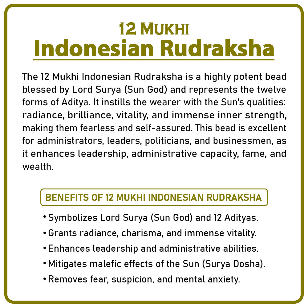 The 12 Mukhi Rudraksha from Indonesia is a sacred bead revered in Hinduism for its spiritual, material, and health benefits. Representing Lord Surya, it empowers the wearer with confidence, vitality, leadership, and prosperity.