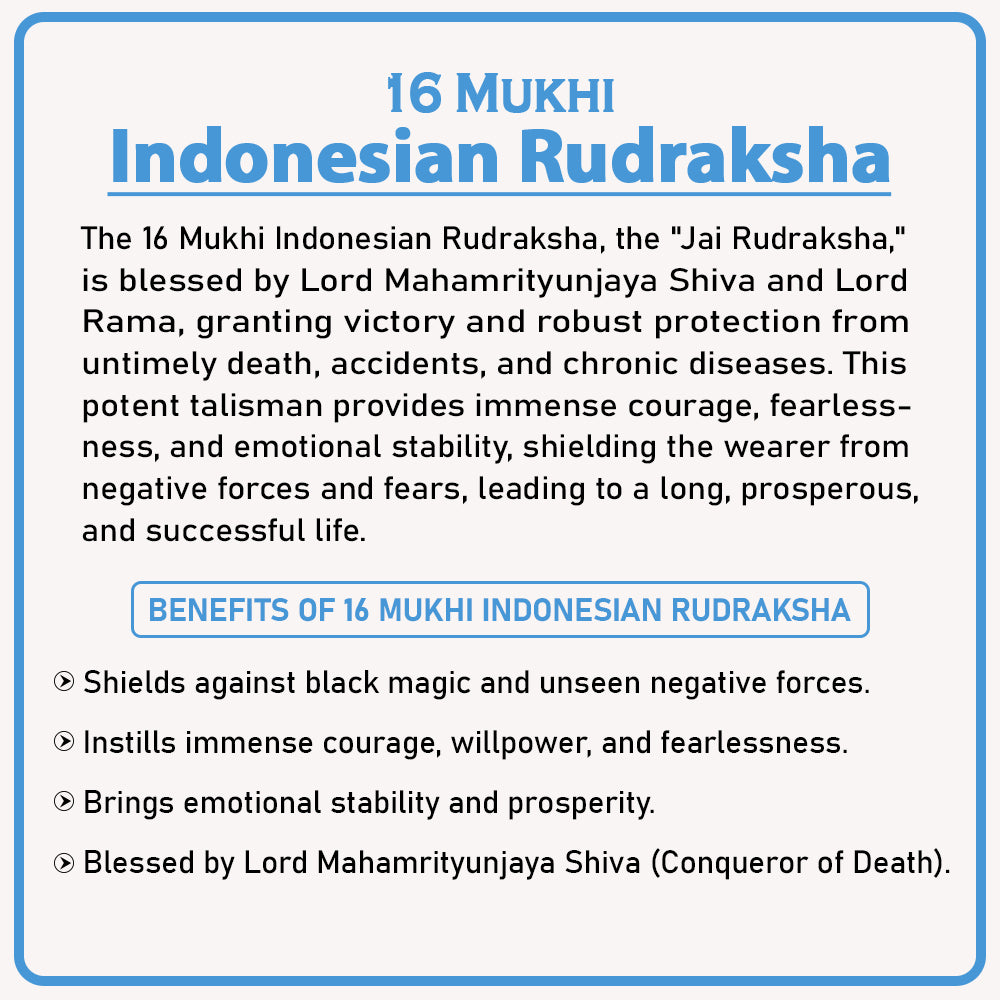 The Indonesian 16 Mukhi Rudraksha is smaller in size but holds subtle and steady vibrations, perfect for daily wear and meditation. It is revered by devotees seeking strength, safety, and spiritual growth.