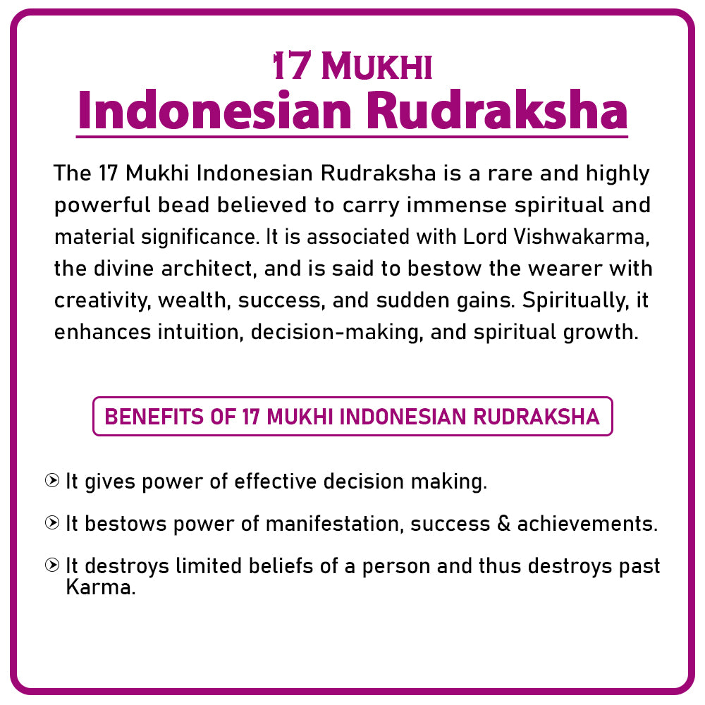 Experience the divine power of the rare 17 Mukhi Rudraksha, a sacred bead that embodies the blessings of Lord Vishwakarma, the celestial architect of the universe. Handpicked from the serene forests of Indonesia, this authentic seventeen-faced Rudraksha is highly revered for bestowing prosperity, success, and spiritual evolution upon its wearer.