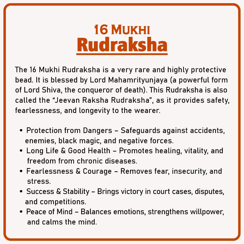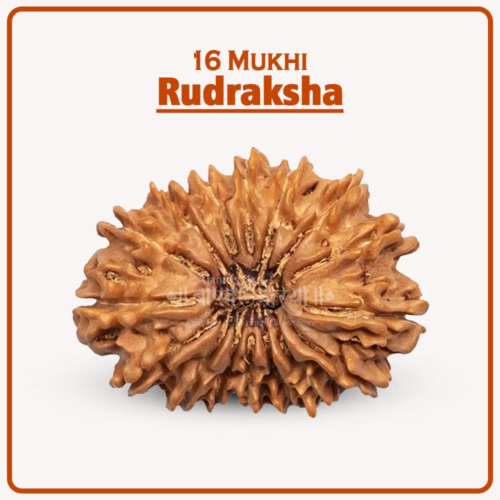 The 16 Mukhi Rudraksha is known as the “Jai Rudraksha”, symbolizing victory, fearlessness, and divine protection. It is believed to embody Lord Mahamrityunjaya, a powerful form of Lord Shiva who conquers death and grants long life.