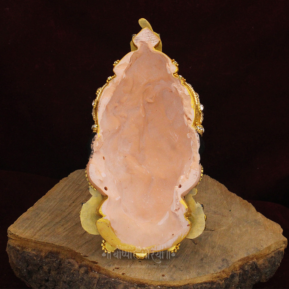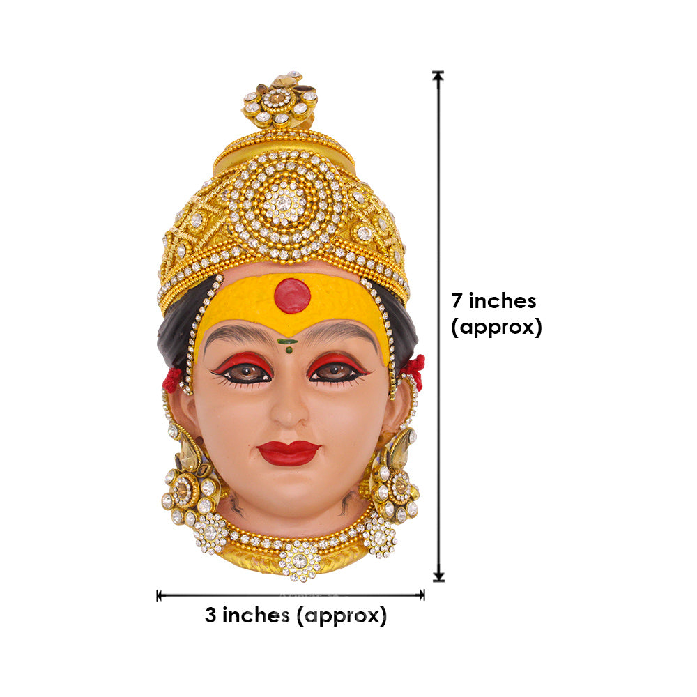 Make: Made of premium fiber. Devi face adorned with traditional Adorn Shringar base featuring detailed zardosi work, vibrant colors, moti embellishments, and decorative stones.