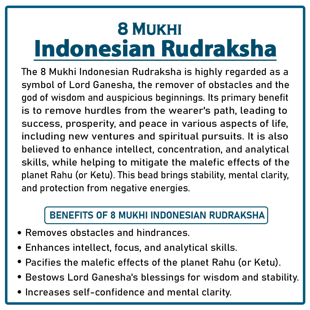 The Eight Mukhi Rudraksha is a sacred bead representing Lord Ganesha, the remover of obstacles and bestower of success. Sourced from Indonesia, this rare eight-faced Rudraksha is highly revered by devotees seeking financial prosperity, wisdom, and spiritual blessings. Carefully sourced from the pristine forests of Indonesia, this eight-faced Rudraksha is highly revered by devotees seeking wisdom, financial prosperity, and spiritual blessings.