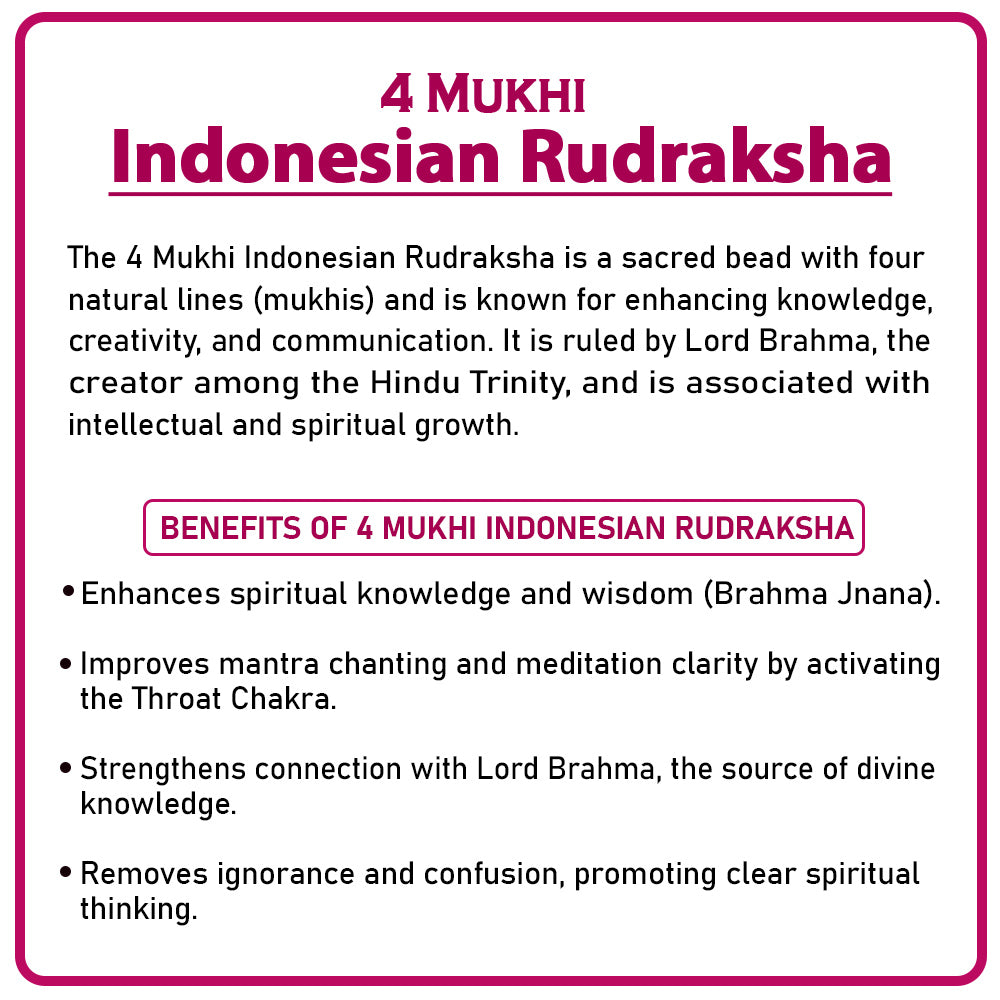 The Four Mukhi Rudraksha is a sacred, rare bead representing Lord Brahma, the creator and god of wisdom. Sourced from Indonesia, this quad-faced Rudraksha is cherished by devotees, students, and spiritual seekers for its exceptional power to enhance knowledge, intellect, and spiritual understanding.