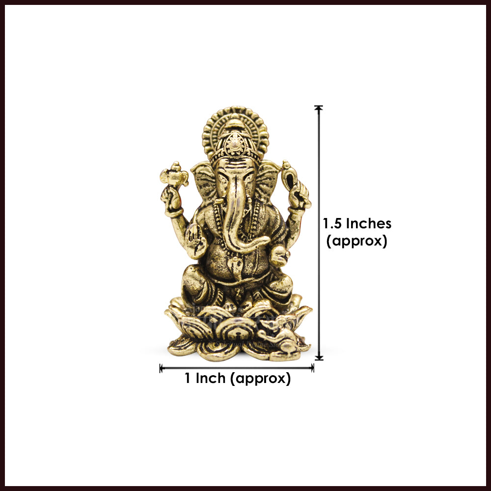 Made from premium-quality brass with an elegant antique gold finish, the idol features fine detailing and a traditional temple-style appearance. Its compact size of approximately 1.5 inches in height and 1 inch in width makes it perfect for placement in a home mandir, office desk, shop counter, locker, or car dashboard.