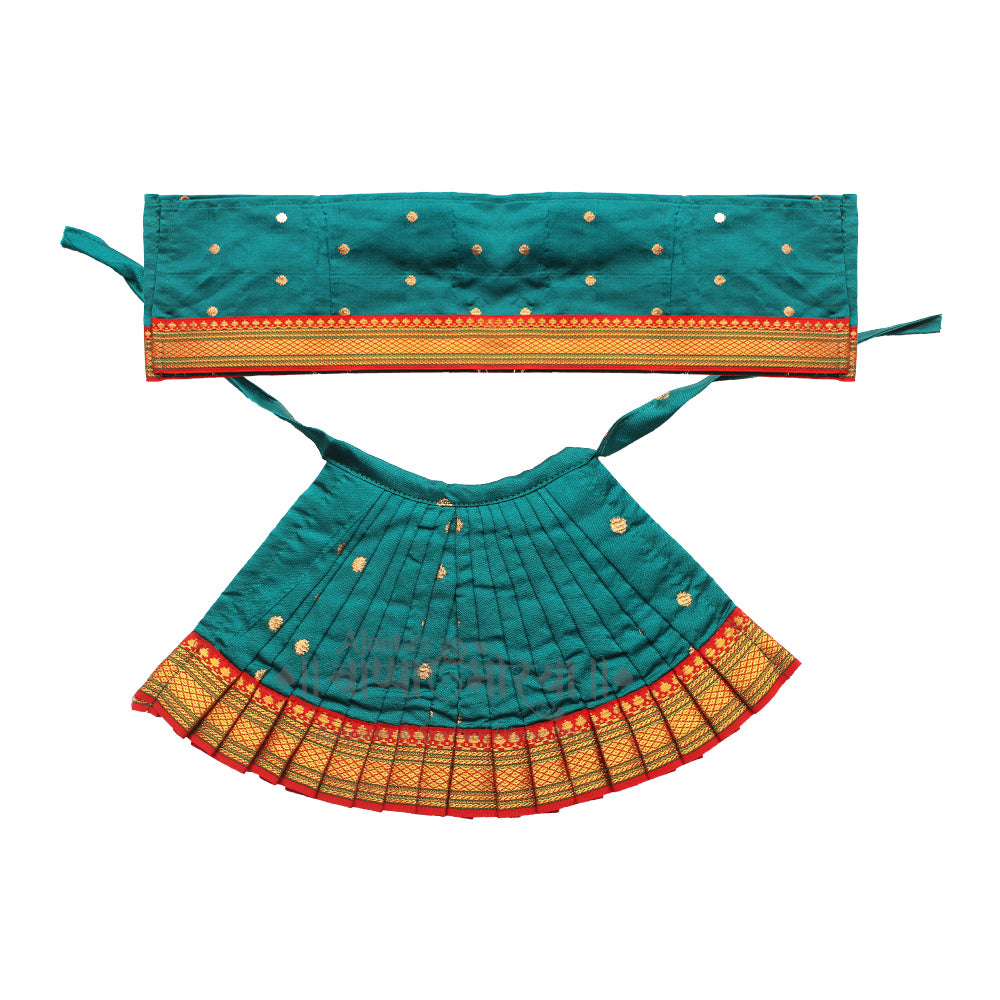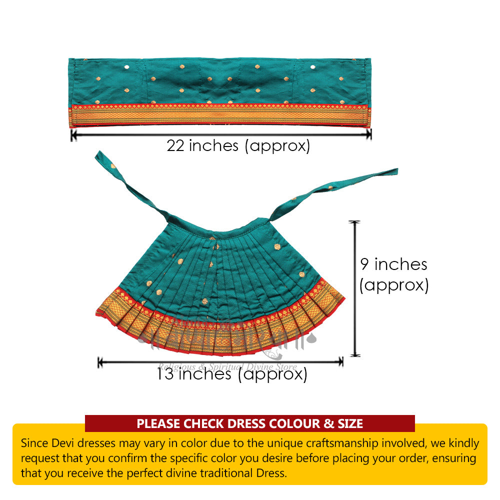 • Premium Handcrafted Quality – Beautifully stitched Devi dress set (blouse + skirt) made from rich fabric with zari border.