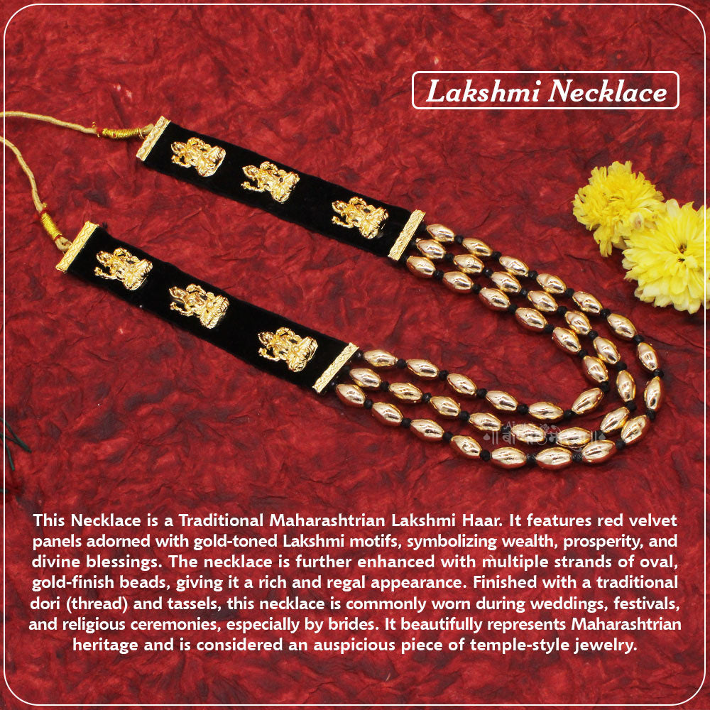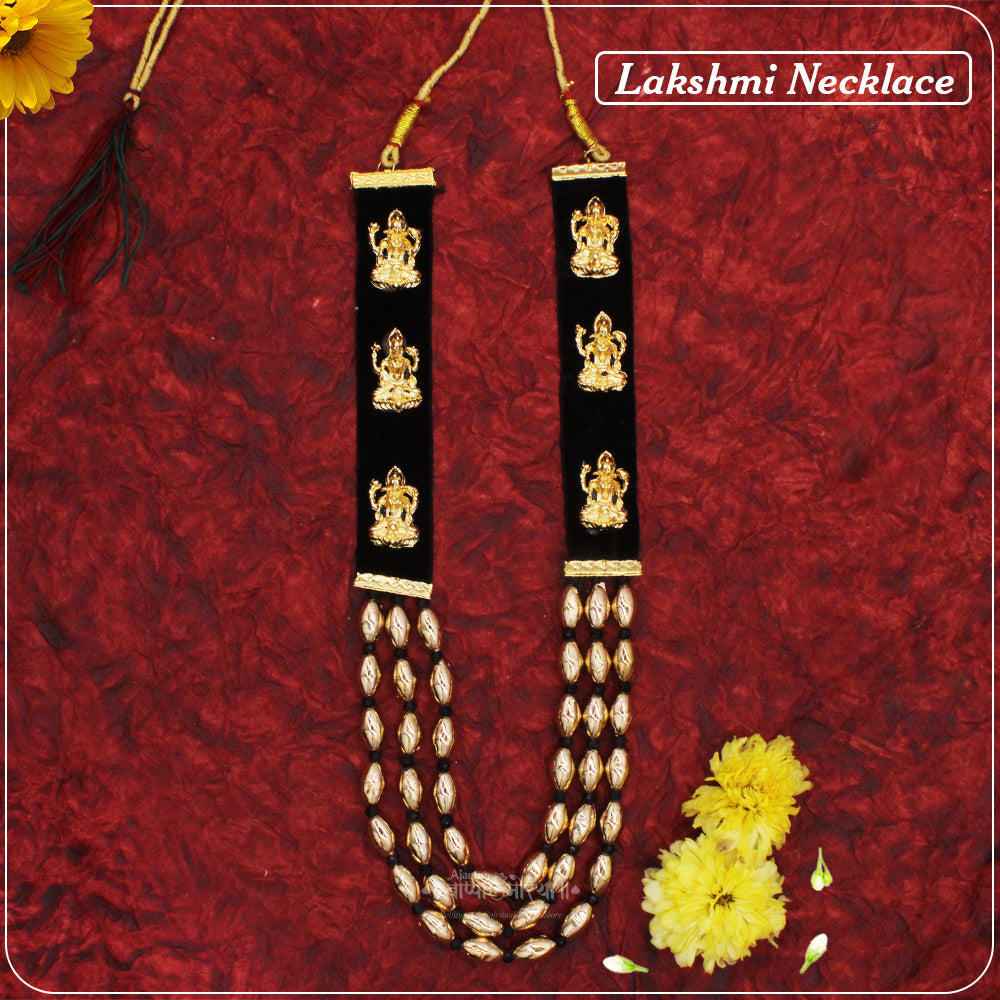 Enhance the divine beauty of your goddess idol with this traditional Lakshmi Haar / Necklace, thoughtfully designed for shringar and temple decoration. Crafted with a rich black velvet-finish base and adorned with beautifully detailed golden Lakshmi motifs, this necklace brings an elegant and sacred charm to any home mandir or temple setup. The multi-strand bead detailing at the bottom adds a classic touch, reflecting traditional Indian devotional jewellery style.