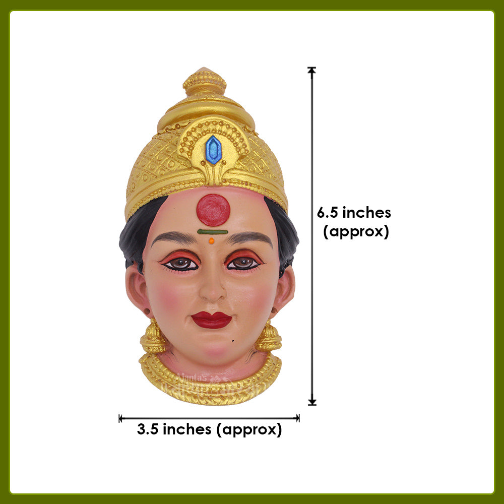 Bring home the divine blessings of Dhanashree Devi with this exquisitely handcrafted Devi Face Mukhavata, designed to infuse your home temple with spiritual energy, beauty, and tradition. Skillfully made by Indian artisans, this idol features a finely detailed golden crown, expressive eyes, a bold red bindi, and elegant facial features that symbolize purity and grace.