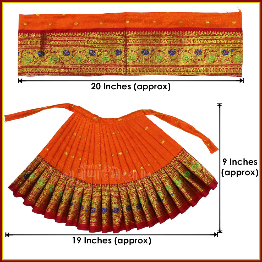 Enhance the divine beauty of your Goddess idol with this Maharani Devi Dress (Orange Poshak), crafted from premium brocade silk. The vibrant orange hue symbolizes energy, devotion, and auspiciousness, while the golden zari border and intricate floral patterns add a regal touch to your temple décor.
