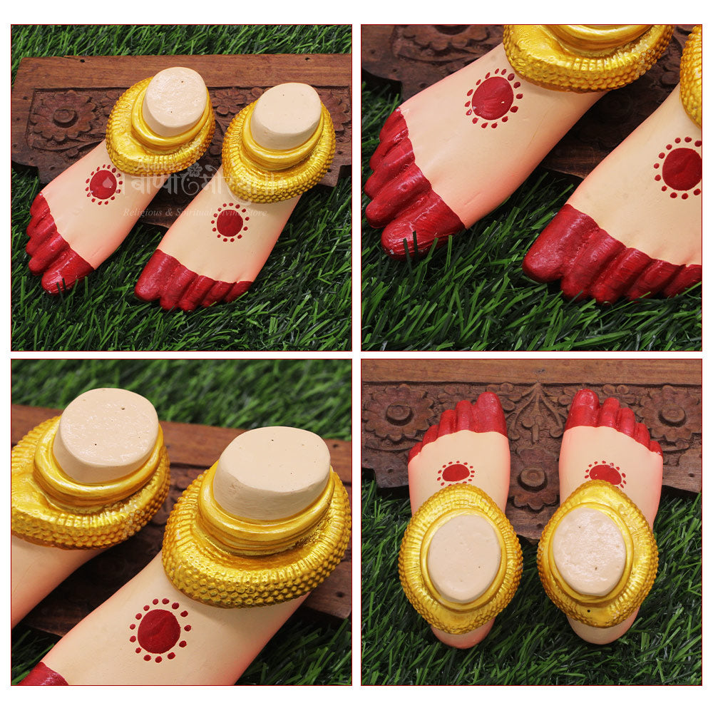 Traditional Design: Features red alta-painted toes, golden anklet design, and sacred red mandala symbol for an authentic devotional look.