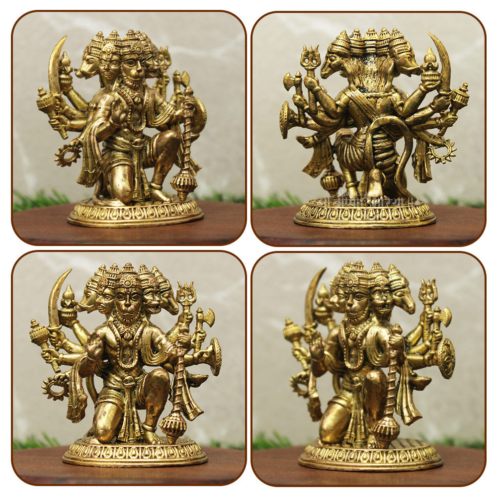 Made from premium-quality brass, the idol features an antique golden finish with finely detailed craftsmanship, showcasing the traditional weapons, ornaments, and dynamic posture of Panchmukhi Hanuman. Despite its small size, the murti carries deep spiritual significance and is ideal for daily worship.