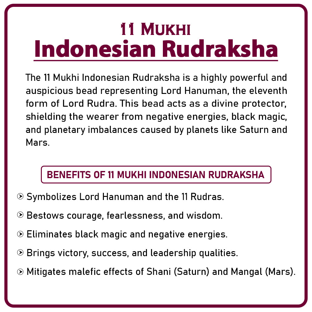 Wearing the 11 Mukhi Indonesian Rudraksha helps remove obstacles, negative influences, and fears. It grants clarity in decision-making, enhances memory power, and supports success in personal and professional life. Lord Hanuman’s blessings bring protection from evil energies and improve focus, determination, and spiritual growth.