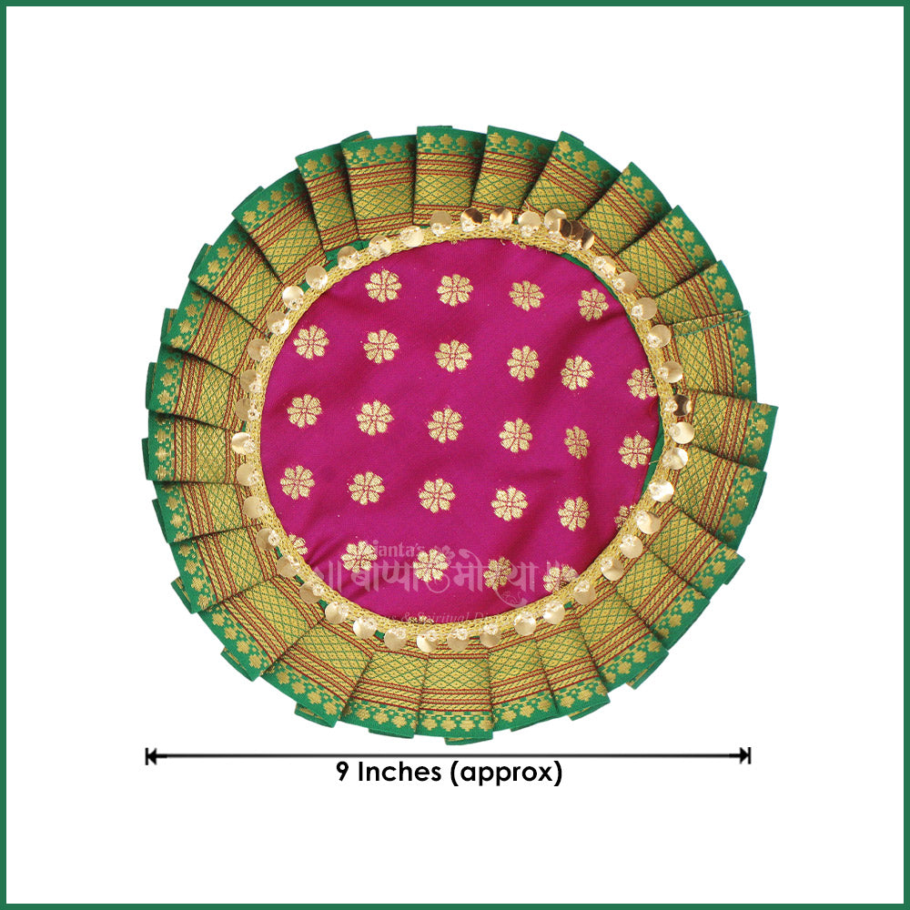 Enhance your pooja space with this Samai Aasan Paithani Silk (9 Inch) in a beautiful green and red combination, symbolizing prosperity and devotion. Made from premium silk fabric, this round aasan features golden floral weaving with a rich Paithani border, giving it a traditional and auspicious look.