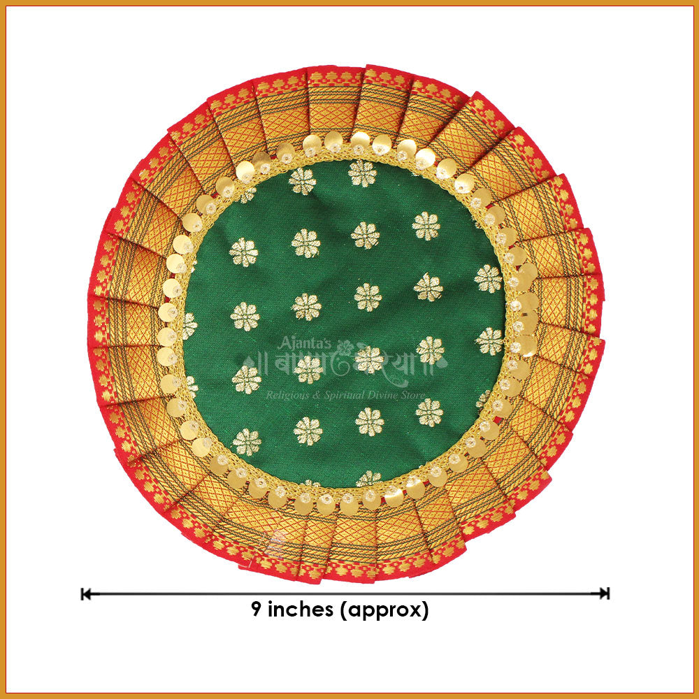 Enhance your pooja space with this Samai Aasan Paithani Silk (9 Inch) in a beautiful green and red combination, symbolizing prosperity and devotion. Made from premium silk fabric, this round aasan features golden floral weaving with a rich Paithani border, giving it a traditional and auspicious look.