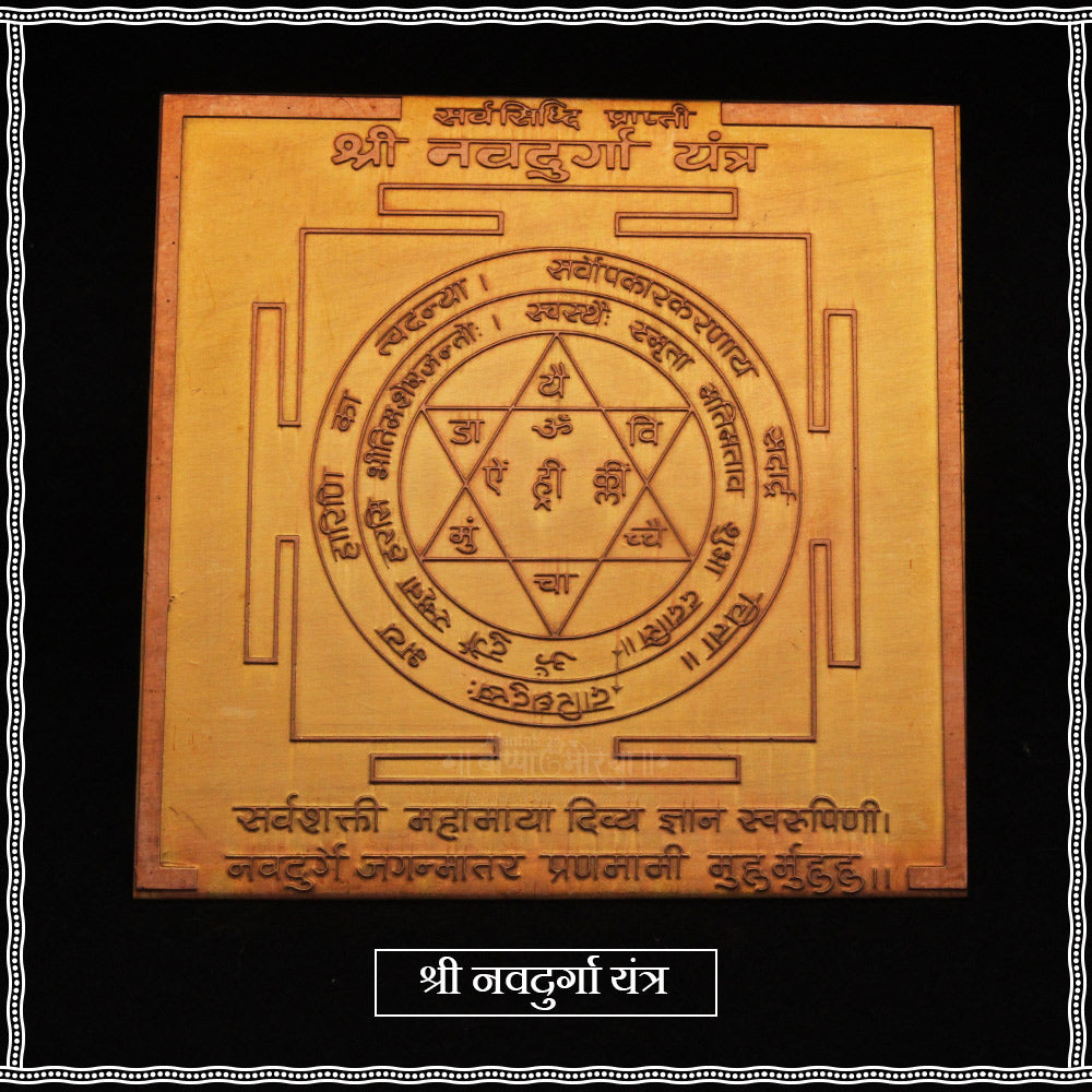 The Navdurga Yantra is a powerful Shakti Yantra dedicated to the nine divine forms of Goddess Durga—Shailputri, Brahmacharini, Chandraghanta, Kushmanda, Skandamata, Katyayani, Kalaratri, Mahagauri, and Siddhidatri.