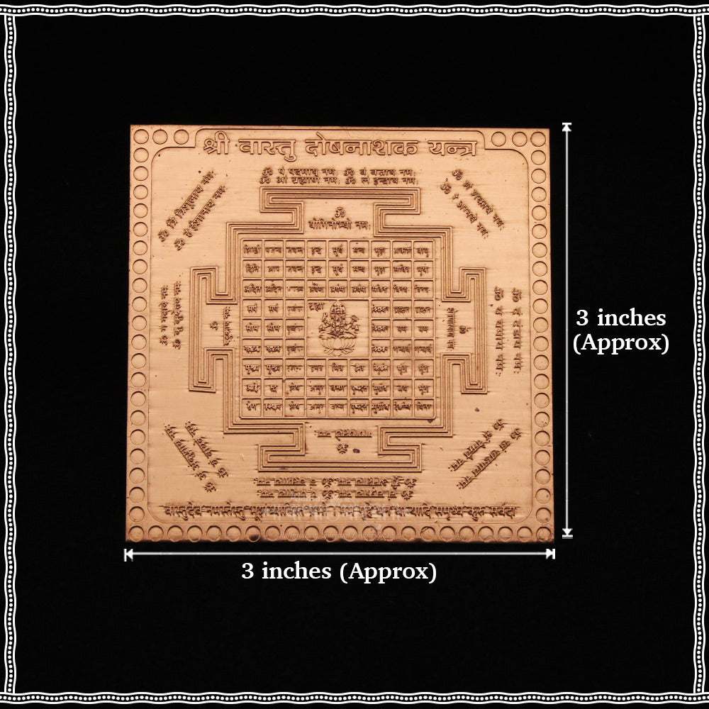 The Shri Vastu Dosh Nashak Yantra is a traditional vastu correction yantra used to help balance negative vastu energies in homes, offices, shops, and workspaces.Made from pure copper, this yantra is engraved with sacred vastu symbols and mantras. It is commonly placed in the pooja room, living area, or vastu-affected direction as suggested by vastu practice.Its compact 3×3 inch size makes it convenient for daily worship and vastu remedies. Regular lighting of diya or incense near the yantra is considered beneficial.