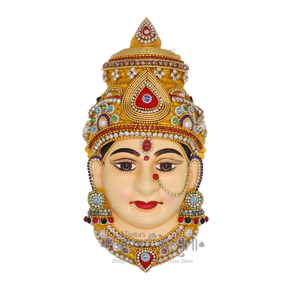 Celebrate divinity with this handcrafted Devi Face (Mukhovat), a perfect blend of tradition and artistry. Made from durable fiber, it is beautifully adorned with zardosi work, multicolour stones, zari, and moti decorations, giving it a divine and festive appearance.