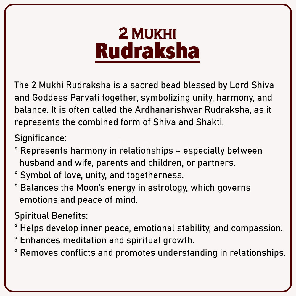 The 2 Mukhi Rudraksha is a sacred bead that symbolizes the divine union of Lord Shiva and Goddess Parvati. It is considered a powerful Rudraksha for improving harmony in relationships, emotional stability, and peace of mind. This bead is highly recommended for those seeking balance in personal and professional life. It can be worn on the neck, wrist, or kept in a sacred space. Each bead is natural to ensure authenticity.